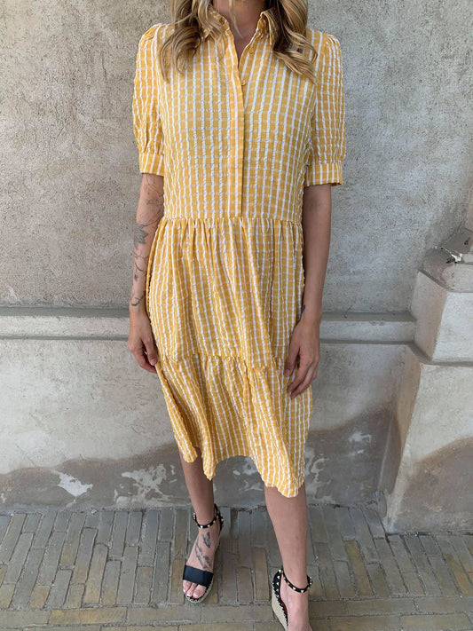 BESKRIVELSE: Kortærmet maxikjole i prikket meshkvalitet. Kjolen har korte ærmer og opretstående flæsekrave. STØRRELSE: Pasformen er...