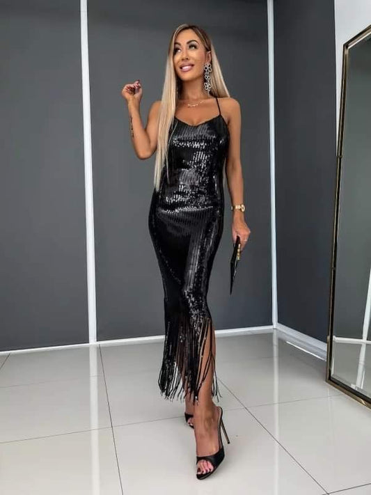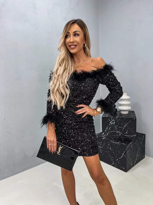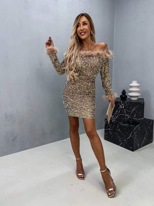 Beskrivelse: lækreste palliet kjole med fjer pynt og smukke detaljer på.