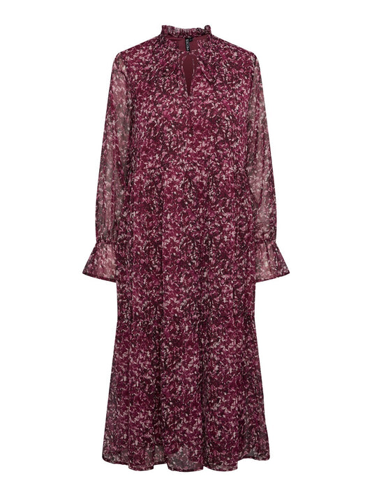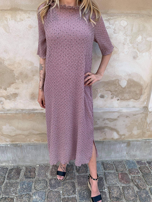 BESKRIVELSE: Kortærmet maxikjole i prikket meshkvalitet. Kjolen har korte ærmer og opretstående flæsekrave. STØRRELSE: Pasformen er...