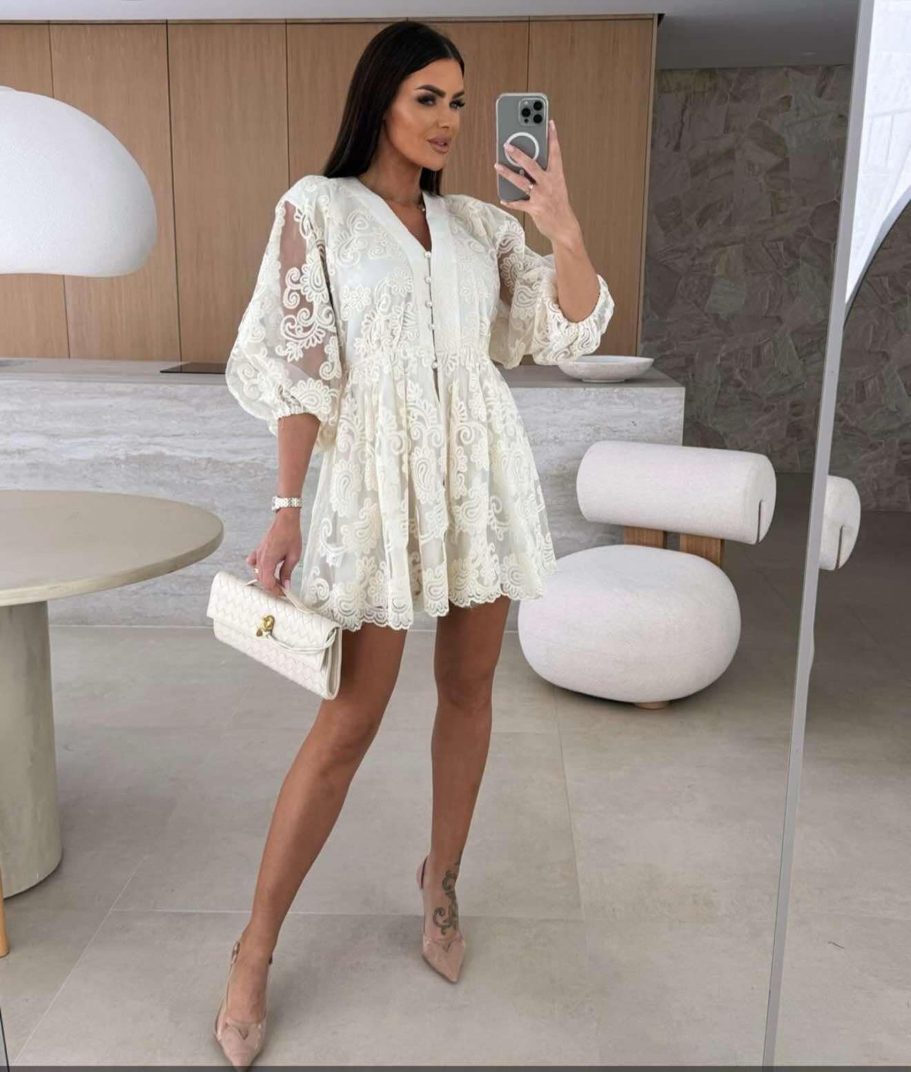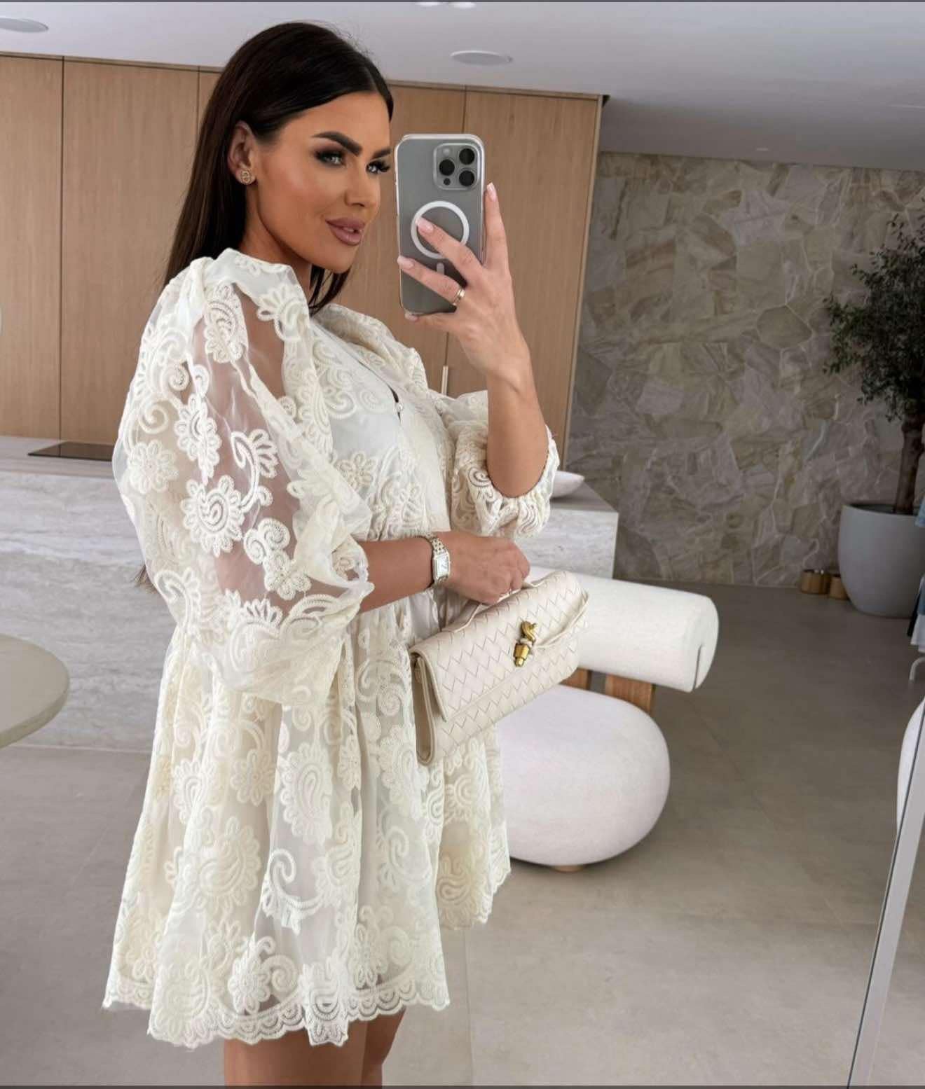 Beskrivelse: lækreste kvalitets kjole med blonder og det skønneste snit.